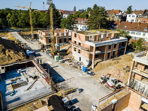 Die östlich (links) der Baustraße liegenden Hofhäuser (7, 5, 3) sind rohbauseitig nahezu fertiggestellt. Bei diesen Gebäuden sind die Staffelgeschosse mit den späteren Dachterrassen bereits deutlich zu erkennen. Das vorderste Haus in dieser Reihe(Haus 1) und das erste Hofhaus westlich (rechts) der Baustraße (Haus 6) sind ebenfalls weit fortgeschritten.