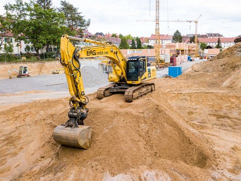 Bei Haus 4 wurde gerade das Kellergeschoß fertiggestellt. Im nördlichen Baufeld, Richtung Straße „Am Fasanengarten“, wurde inzwischen ein dritter Kran aufgestellt. In diesem Abschnitt beginnen bereits die Arbeiten an den Bodenplatten der Keller für den „Kopfbau“. Das Baustellenniveau der Baustraße befindet sich derzeit unterhalb der Höhe des späteren Kellerbodens, weshalb die Gebäude jetzt sehr mächtig wirken.