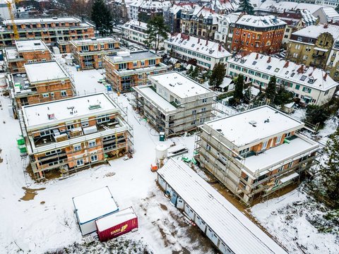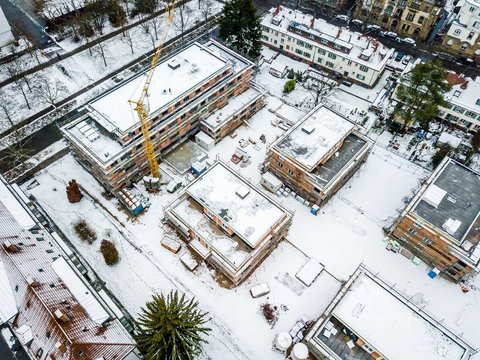 Die Innengewerke laufen, vom Wetter unbeeindruckt, auf vollen Touren. Hier ein kurzer Überblick zum Stand der Ausbauarbeiten: Die Rohinstallationen von Heizung, Sanitär und Elektro sind in allen Hofhäusern abgeschlossen. Die Innenputzarbeiten und Estricharbeiten wurden ebenfalls in allen Hofhäusern, außer dem zuletzt gebauten Haus 2, fertiggestellt. Der Fliesenleger ist bereits mit den Wohnungen in zwei Hofhäusern fertig und arbeitet im Dritten. Der Maler schließt gerade seine Arbeiten in den Wohnungen des ersten Hofhauses ab. Im Kopfbau sind bereits die Trockenbauwände in allen Wohnungen gestellt. Hier werden in Kürze die Fenster eingebaut.