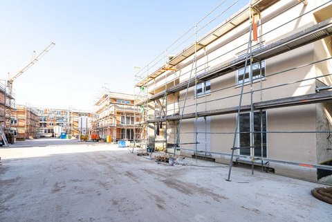 Beim Kopfbau sind zwischenzeitlich auch die Fenster im Erd- und Dachgeschoss vollständig montiert. Des Weiteren wurden die Hauseingangstüren der Hofhäuser und die Wohnungseingangstüren auf den Laubengängen des Kopfbaus geliefert und eingebaut. Auch die Außenputzarbeiten sind bei den südlichen Hofhäusern weiter fortgeschritten. Teilweise wurden hier schon Fassaden mit dem eingefärbeten Oberputz hergestellt, so dass sich die spätere Optik der Hofhäuser stellenweise schon erahnen lässt.