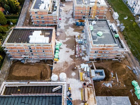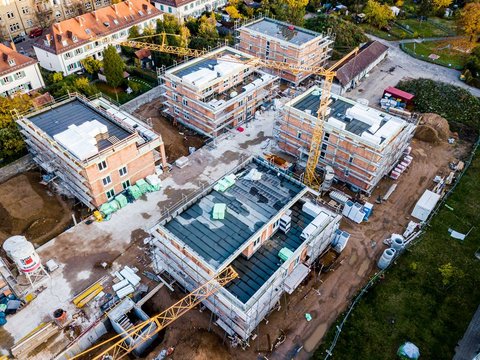 Die weißen Pakete auf einigen Hofhäusern enthalten Dämmplatten, die bei diesen Gebäuden im nächsten Schritt auf den Dachflächen verlegt werden.